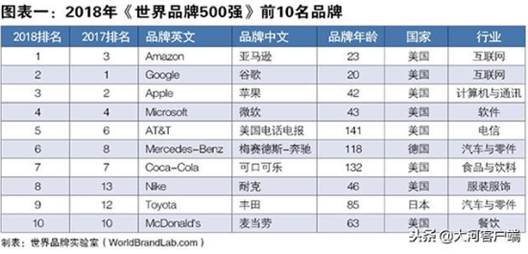 在世界品牌500強前五分別是亞馬遜、谷歌、蘋果、微軟、美國電話電報,都是美國公司。中國躋身於世界品牌500強的國家電網、騰訊、海爾,排名分別為30、39、41。