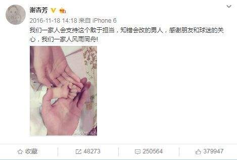 再早之前,面對林丹的出軌事件,謝杏芳發了類似的照片,也是説一家人要風雨同舟。