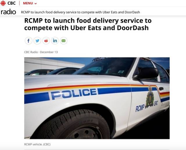 新聞是這麼寫的:“眾所周知,今年加拿大皇家騎警預算被砍35%,因此發言人竟然表示要接受送餐服務!警方稱:和其他外賣公司,最大的優勢就是速度,比其他外賣服務商快30分鐘!”
