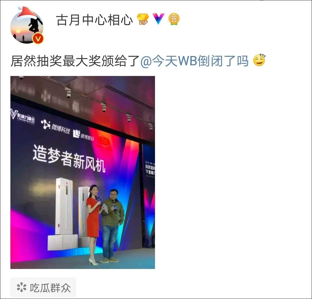 據其他到場參加峯會的博主透露,在現場活動進行到最後一輪抽獎時,獎品價值7000多元,抽到的是一位大哥。大哥上台領獎後,主持人與其互動,詢問他的微博ID叫什麼。這位中獎的大哥雖然喜悦,卻沒有被衝昏頭腦,支支吾吾不願意説出來。