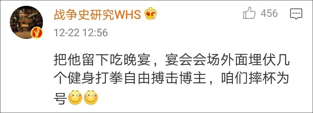 知名博主“戰爭是研究WHS”還笑言,可以把這位中獎大哥留下來吃飯,“宴會會場外面埋伏几個健身打拳自由搏擊博主,咱們摔杯為號”: