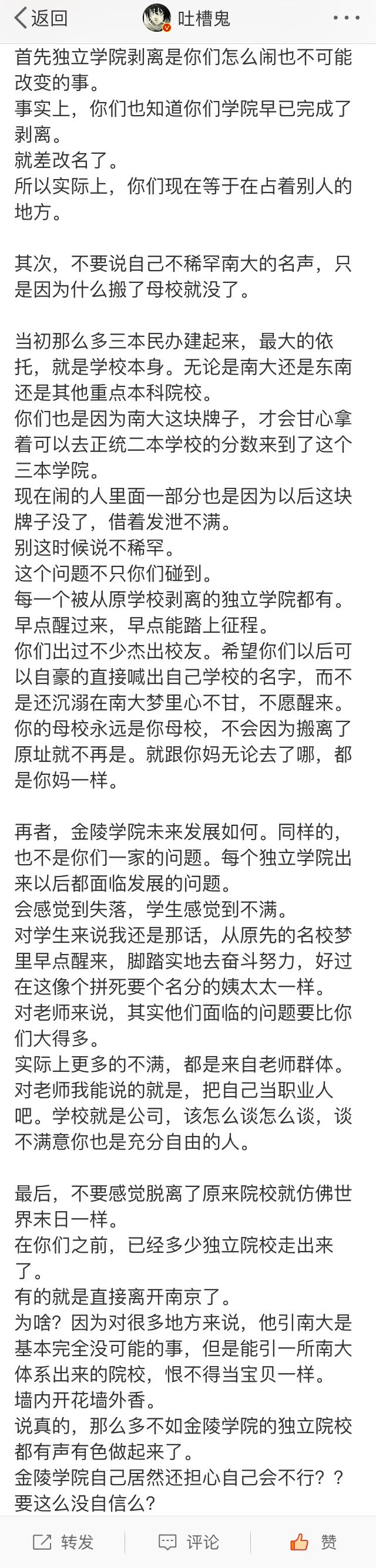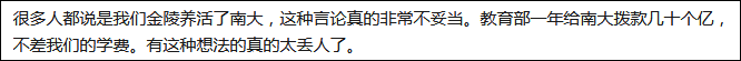 很多人都説是我們金陵養活了南大,這種言論真的非常不妥當。教育部一年給南大撥款幾十個億,不差我們的學費。有這種想法的真的太丟人了