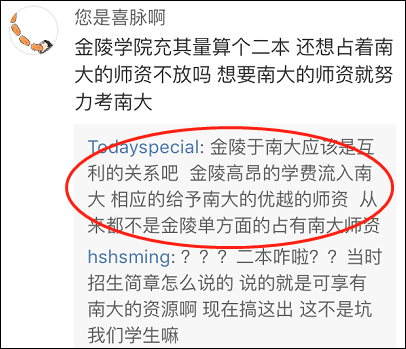 但也有金陵學院的學生認為“金陵養活南大這種想法太丟人了”。