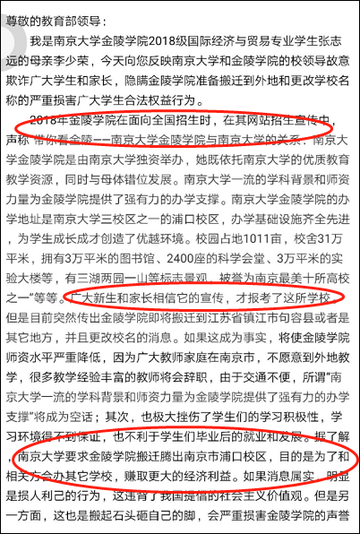 部分學生家長認為南京大學和金陵學院領導“故意欺詐廣大學生和家長……嚴重損害廣大學生合法權益”。
