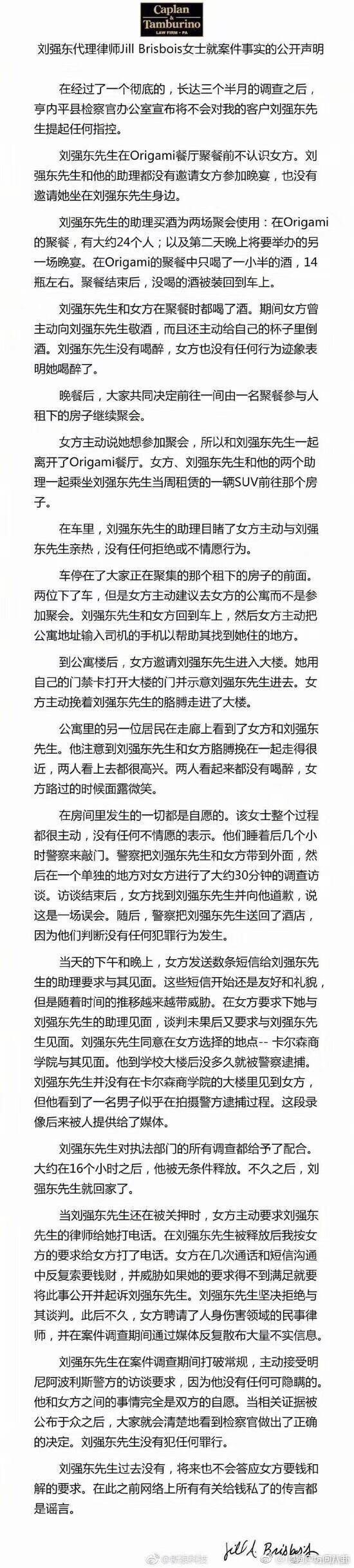 劉強東代理律師Jill Brisbois女士就案件事實的公開聲明稱,在房間裏發生的一切都是自願的。該女士整個過程都很主動,沒有任何不情願的表示。