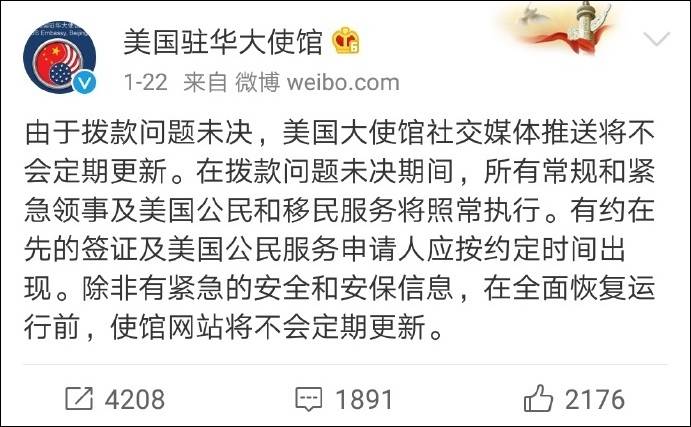 在年初的1月22日,美國駐華大使館官方微博同樣發佈消息稱,由於撥款問題未決,美國大使館社交媒體推送將不會定期更新。