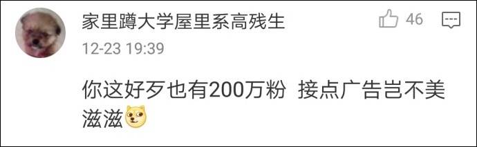 更是有網友説,微博粉絲數量200多萬,微信也是知名大號,隨隨便接點廣告就能輕輕鬆鬆度過眼前的難關了,不用擔心。