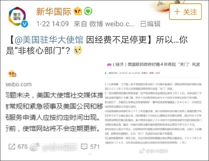 美國駐華使館官微1月22日發佈的微博中提到説,“在撥款問題未決期間,所有常規和緊急領事及美國公民和移民服務將照常執行”。因此,是不是可以推斷……美國駐華使館的微博微信賬號屬於是非核心部門呢?
