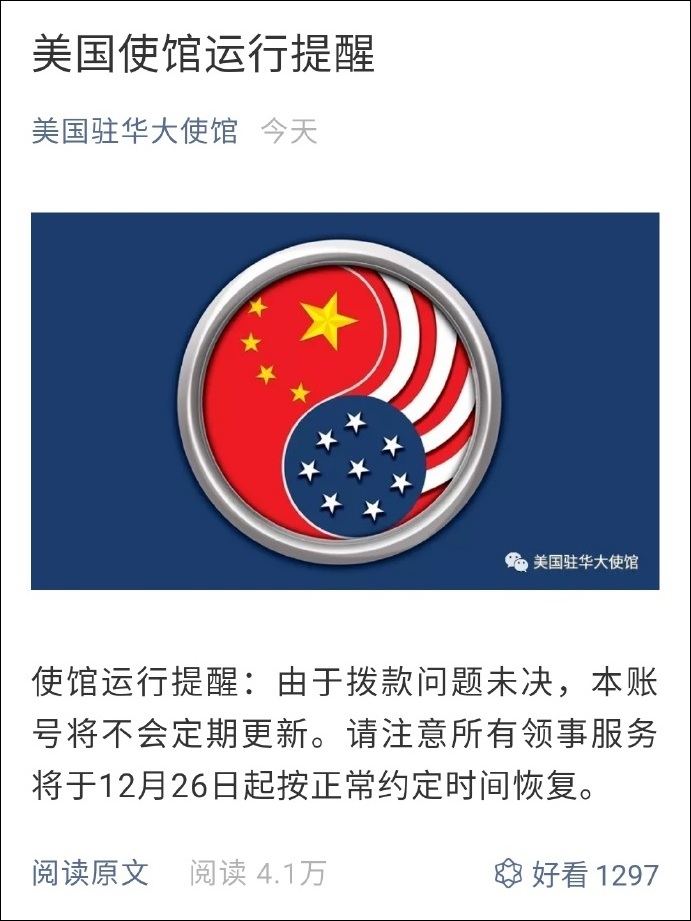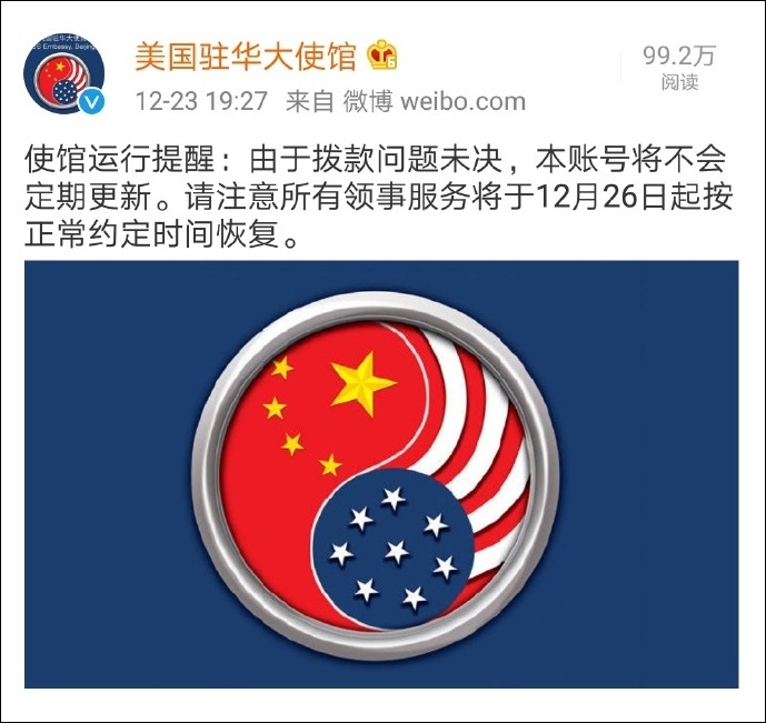 美國政府日前又雙叒宣佈關門停擺,而美國駐華大使館也於今天晚間通過微博微信兩個渠道發佈消息稱:由於撥款問題未決,賬號將進入不會定期更新的狀態。