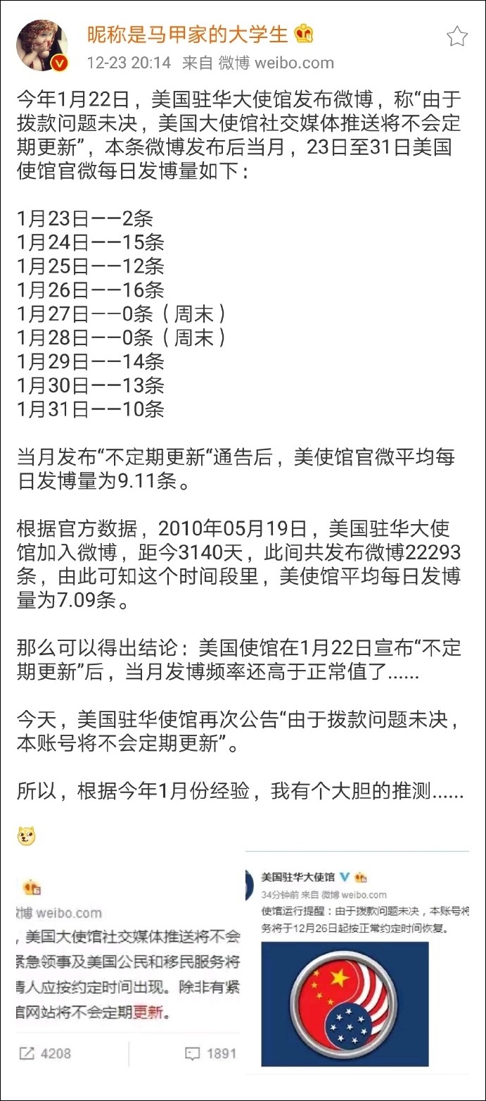 這美國駐華使館的社交賬號真的就會因為經費問題,更新頻率變低嗎?