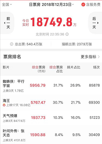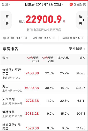 週六新片票房冠軍是一部好萊塢動畫電影,然後上映第3周的《海王》在排片場次不利的局面下,穩壓一眾國產新片。