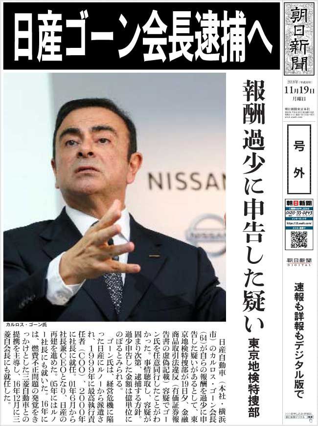《朝日新聞》搶先報道戈恩逮捕的號外