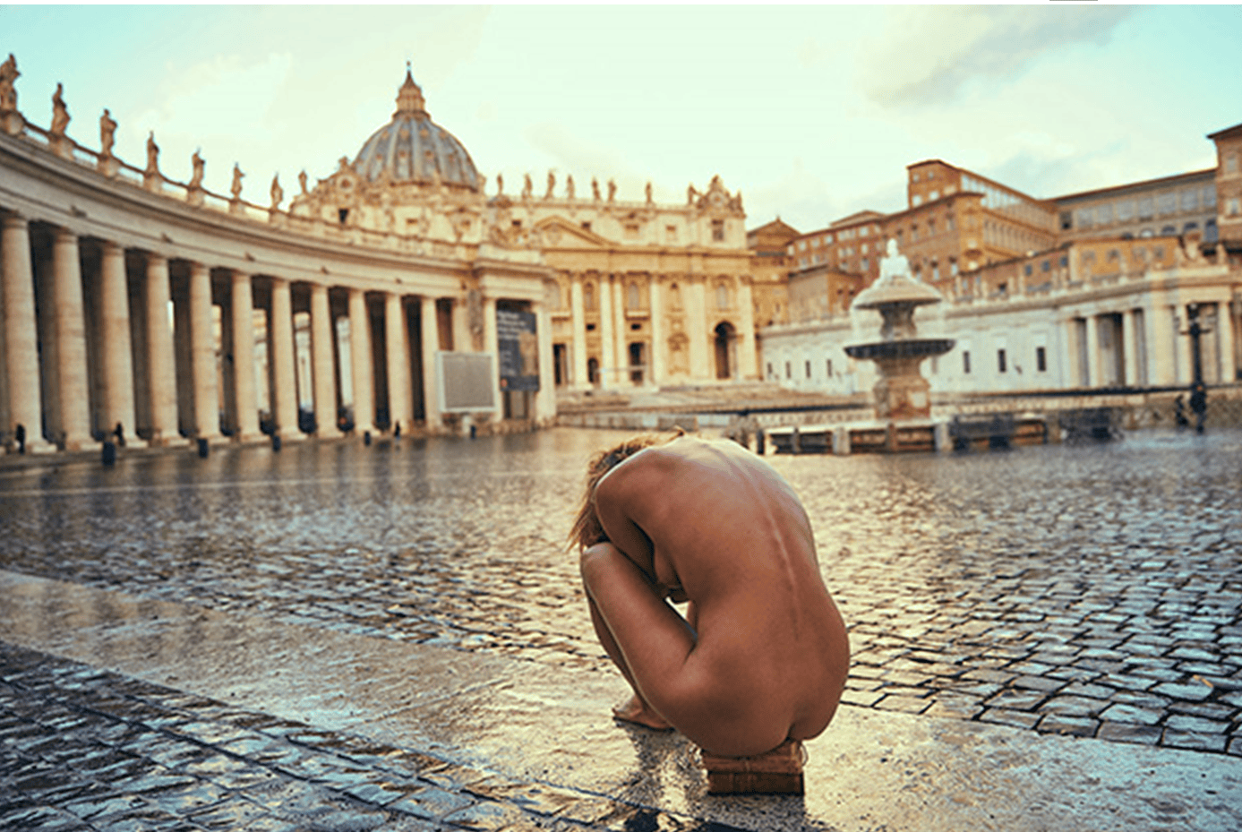 近日,一名標榜行為藝術的模特兒,在梵蒂岡的聖彼得教堂前的廣場,上演了一出叛逆的“好戲”。她裸體坐在《聖經》之上,不知是藝術還是褻瀆呢?