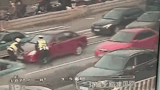 最後,交警趁着女司機搖下車窗向他們喊話的機會,把車門強行打開: