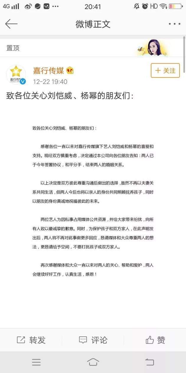 嘉行傳媒聲明稱:“兩人已於今年簽署協議,不再以夫妻關係共同生活,但今後兩人將以親人的身份共同撫養孩子。”