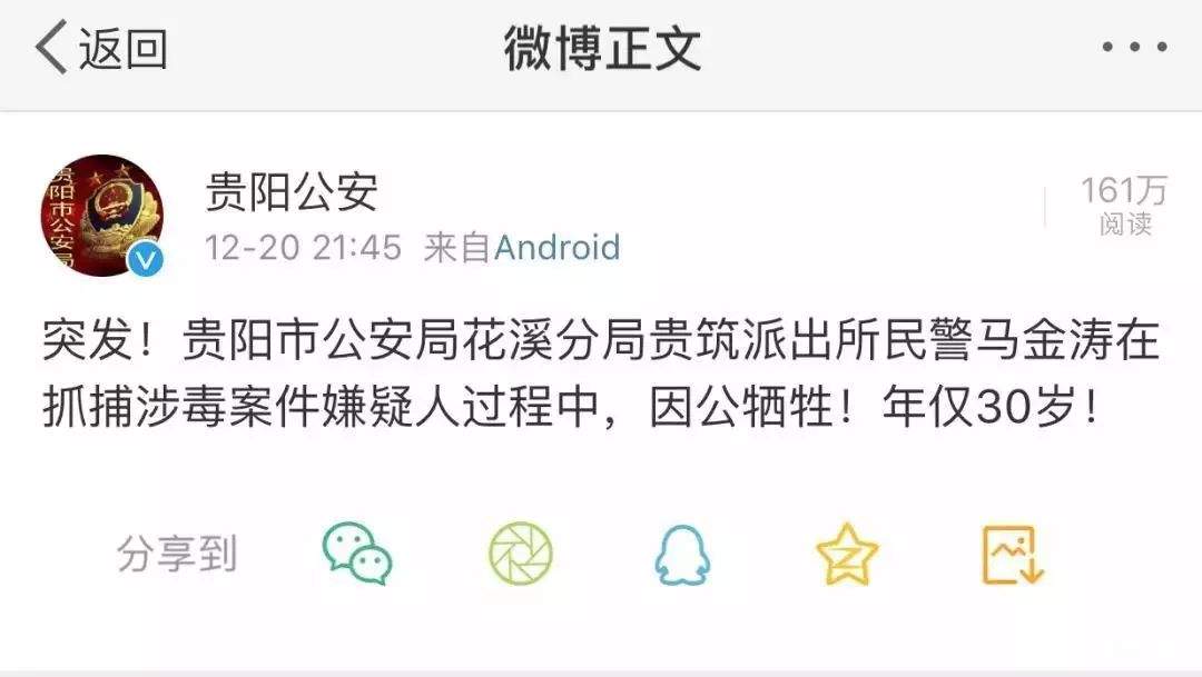 12月20日21時45分,貴陽市公安局官方微博通報稱,貴陽市公安局花溪分局貴築派出所民警馬金濤在抓捕涉毒案件嫌疑人過程中,因公犧牲,年僅30歲。