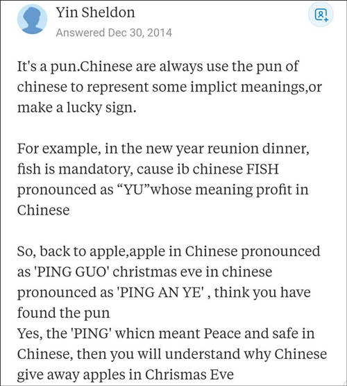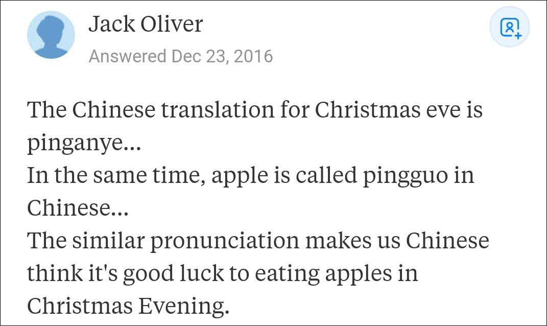 這位Quora網友説,中國人把Christmas eve翻譯成平安夜,與此同時,Apple在中文裏面叫做蘋果。因為兩個詞在中文裏面發音很像,所以中國人就認為在平安夜吃蘋果能夠給他們帶來好運。