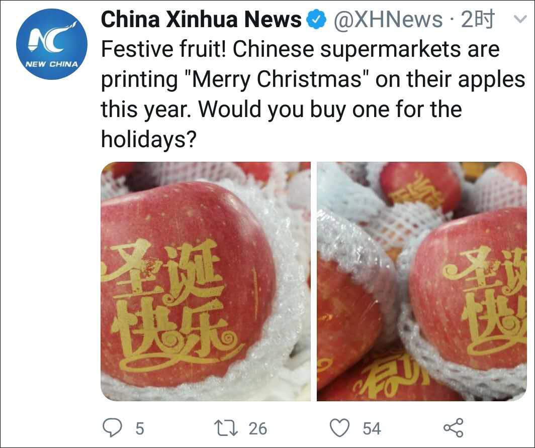 平安夜吃蘋果這個習俗,新華社已經開始對外推廣了。今天新華社的推特發了一條推文説,中國的超市開始賣印有“聖誕快樂”的蘋果了,你會買嗎?評論區有外國網友説,我會買,這看上去很有趣。