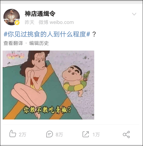 博主@神店通緝令發了一條互動微博,和大家聊聊挑食的事兒,現在已經八萬評論了……八萬!