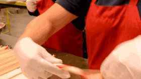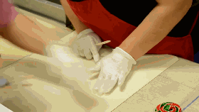 均勻用力,使兩種顏色的糖膏貼合。之後就可以送到輥牀上進行拉條。