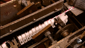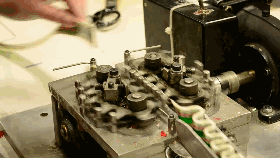 在裝盒的時候,枴杖彎過來的一端會在一塊弧形片的作用下發生旋轉,最終彎鈎“朝上”地放入到包裝盒中。