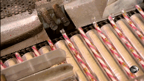 這些糖果繼續在傳送帶上完成冷卻過程後,就可以打包出廠,運送到各個糖果店,被沉浸在節日氣氛中的人買回去掛在聖誕樹上啦!