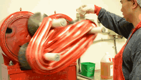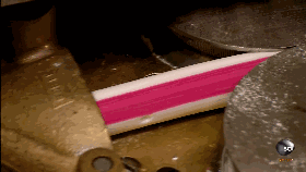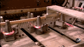 首先是在錐形輥牀滾輪的作用下慢慢變細。與此同時,為了保證糖膏表面的可塑性,會有一個帶有火焰噴槍的機械臂不斷來回加熱。