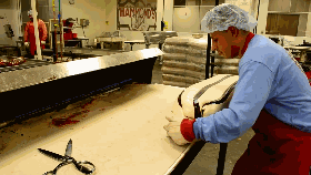 長條狀的糖膏經過扭轉、切割成為長度一致的糖棒,