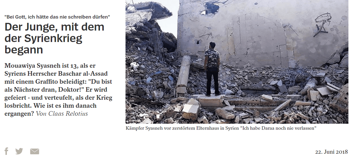 敍利亞,內戰,孩子,反政府軍,驚悚吧,好玩吧,吸引人吧?由於Claas Relotius無法拿到進入敍利亞的簽證,他是通過whatsapp也就是西方版微信的方式採訪了這個所謂的13歲男孩,而且是視頻採訪。內戰的斷壁殘垣,山河破碎加上孩子的淚,這篇報道一出來馬上就成了一篇爆款,成了聲討巴沙爾阿薩德獨裁暴政的戰鬥檄文。