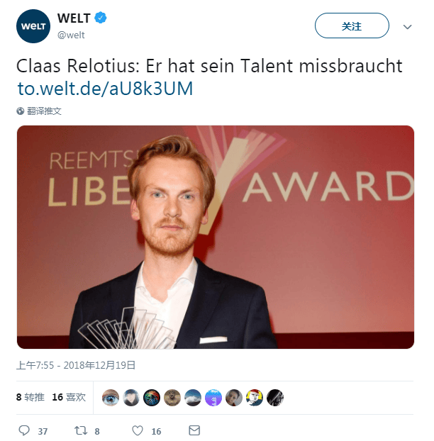 頗有諷刺意味的是,半個月前,拿到德國年度報道大獎的恰恰就是他。媒體人本身成了新聞熱點,Relotius“殺身成仁”自爆,他成了德國《明鏡》週刊12月的最大流量源。