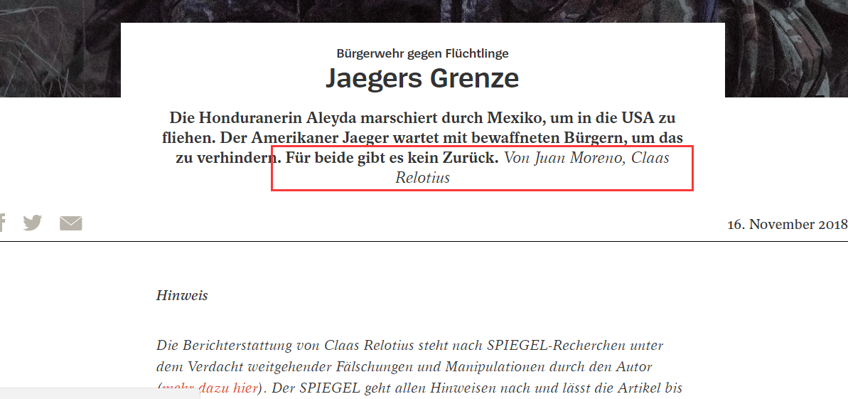 那麼,到底是什麼時候Relotius被戳穿的呢?起因就是11月16的這篇Jaegers Grenze,寫的是一篇關於美墨邊境的美國國防軍,Relotius是第二作者,第一作者是他的同事Juan Moreno。