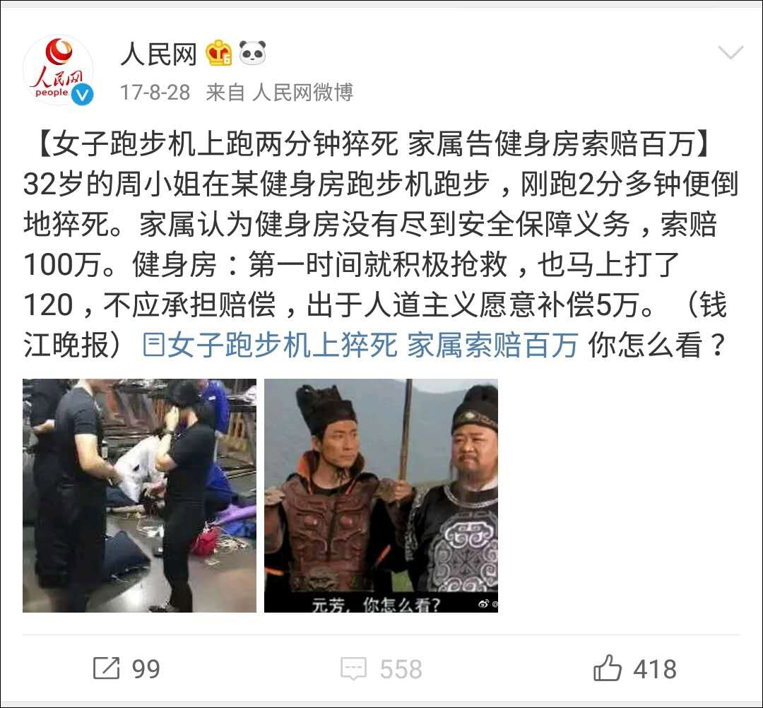 女子跑步機上跑了兩分鐘後猝死,家屬告健身房索賠100萬,家屬認為健身房沒有盡到安全保障的義務。