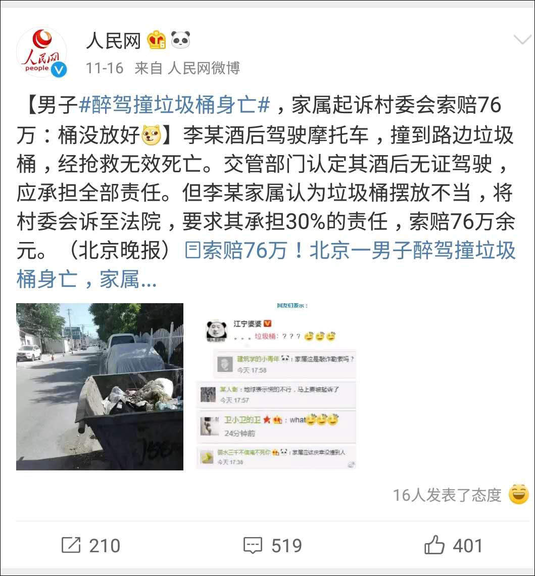 一男子醉駕撞垃圾桶後身亡,家屬起訴村委會索賠76萬,因為垃圾桶沒放好。