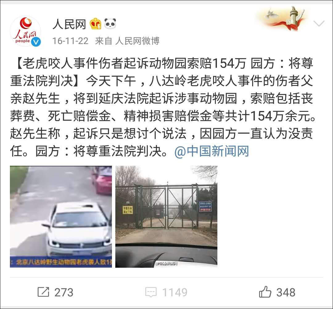 對於索要高額賠償一類的案件,或許影響最廣,報道最多的當屬發生在2016年的老虎咬人事件。由於事件家屬家庭矛盾導致自己在禁止下車的區域下了車,傷者母親被老虎咬死,傷者毀容。與此同時,當事家屬還向動物園方面索要154萬的賠償。