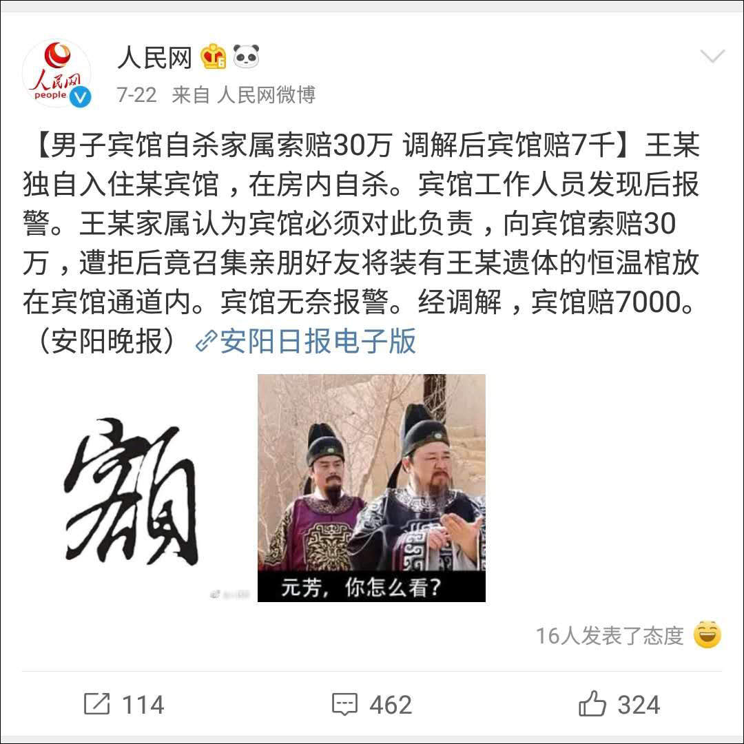 一男子賓館自殺,家屬向賓館索賠30萬,最後經過調解賓館索賠7000元。