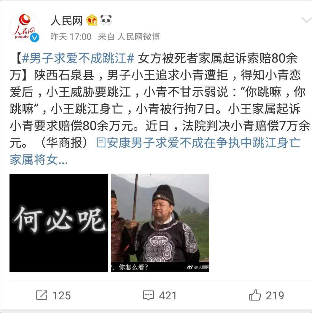 男子求愛不成跳江身亡,死者家屬向女方要求索賠80餘萬元。