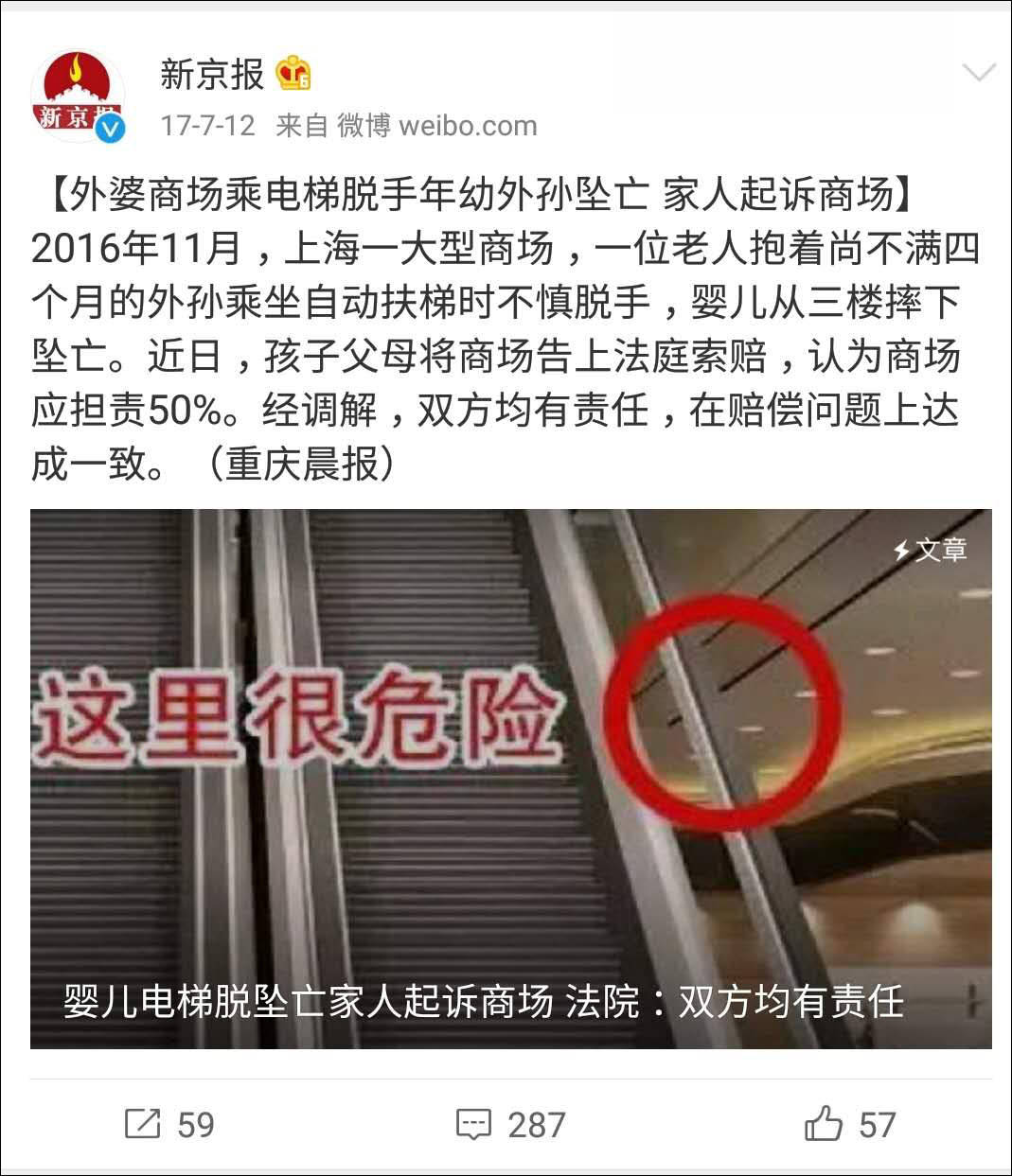 我們從家屬提到的“在商場坐電梯死,還要商場賠”這件事説起。具體家屬指的哪一件事這個很難説,但是從媒體過去報道的新聞來看,有可能指的是發生在上海的一起“外婆帶外孫稱自動扶梯嬰兒不慎從樓上摔下墜亡,家人起訴商場”的新聞。