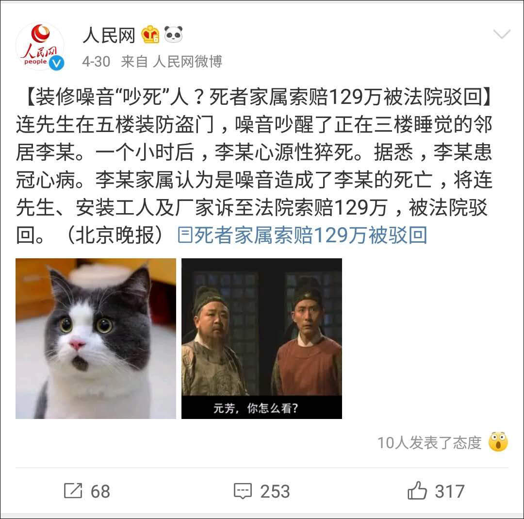 樓上裝防盜門吵醒在三樓睡覺的鄰居李某,一小時後李某心源性猝死,家屬向樓上要求索賠129萬。裝修噪音“吵死”人?