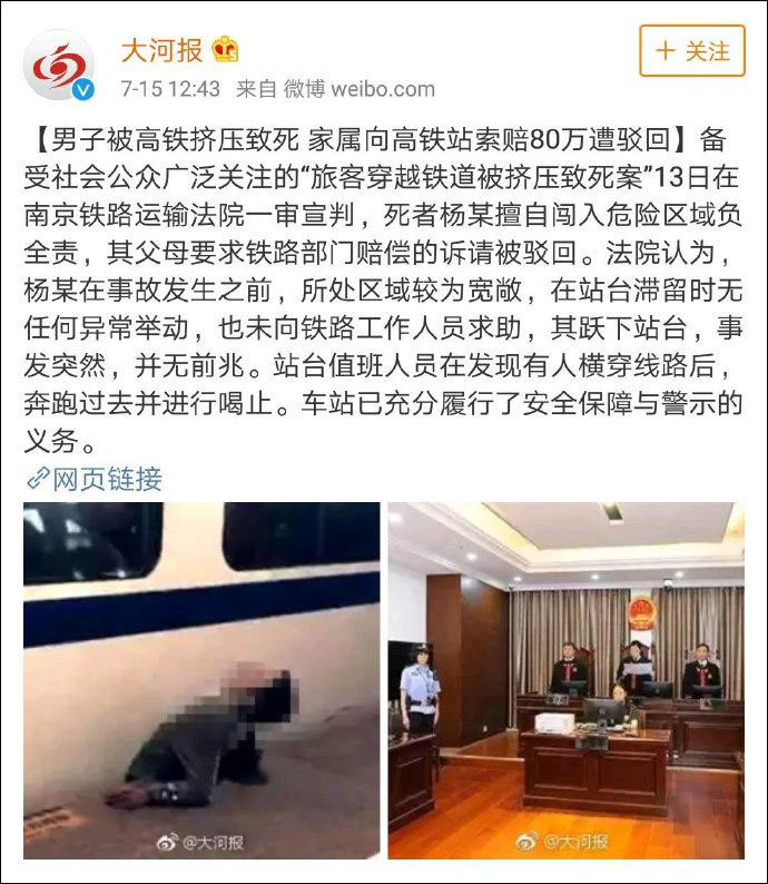 還有一則新聞網友應該也很熟悉,這就是當年男子擅自進入高鐵軌道被高鐵擠壓死,家屬向高鐵站索賠80萬元的事情。