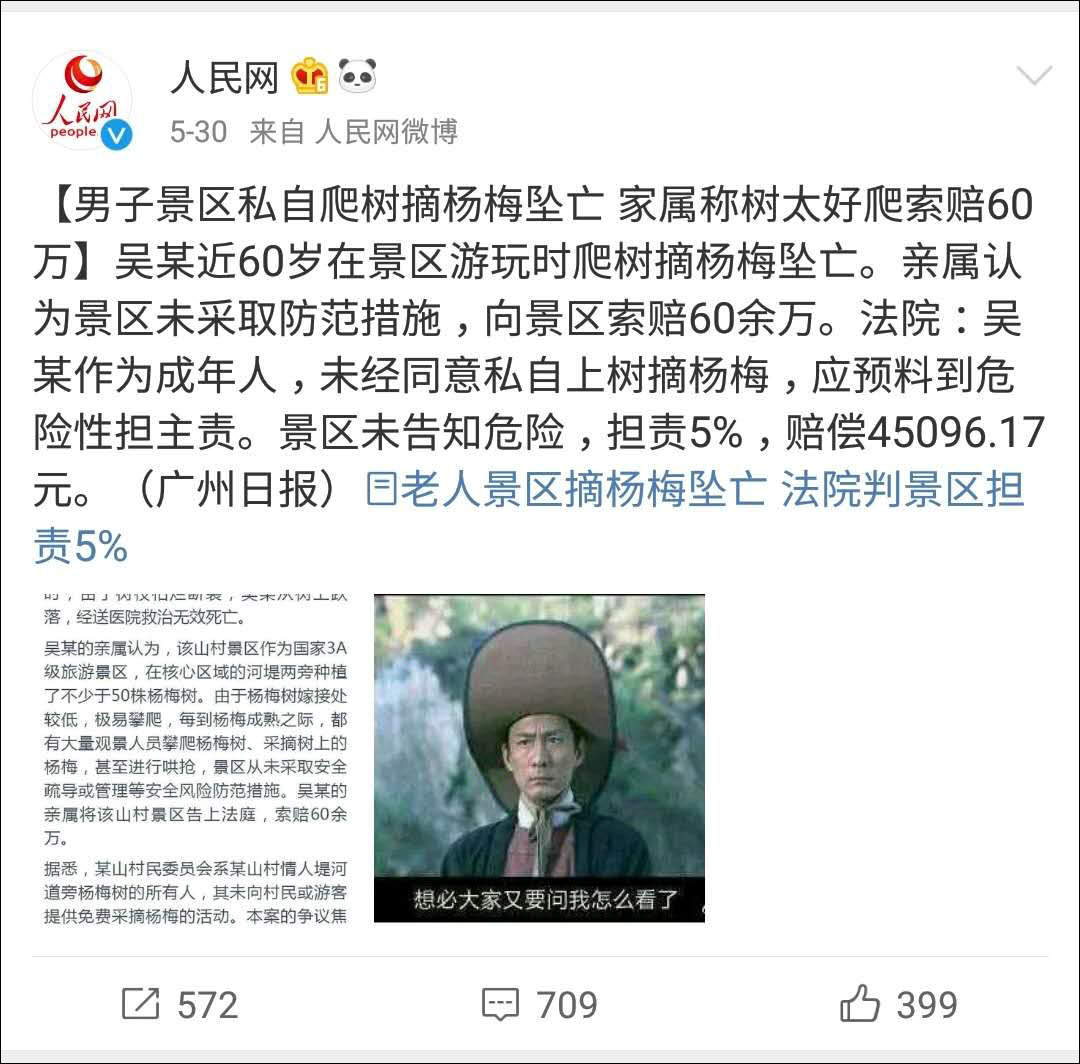 一男子在景區內私自爬樹摘楊梅墜亡,家屬稱樹太好爬,要求景區賠償60萬。