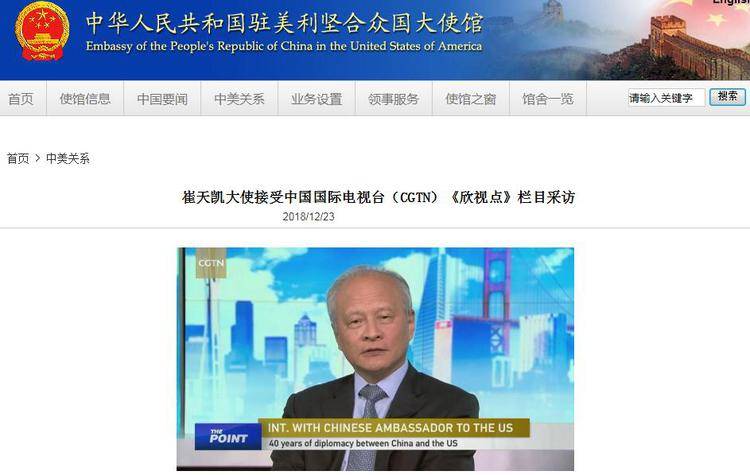 12月21日,在中美建交40週年即將到來之際,中國駐美大使崔天凱接受了中國國際電視台(CGTN)《欣視點》欄目專訪,就中美關係40年曆程、發展現狀及未來展望等回答了主持人劉欣的有關提問。鑑於新年來臨之際,崔天凱在節目中還透露稱要將鄧小平的哲學思想當作新年禮物送給美國,即:解放思想,實事求是。