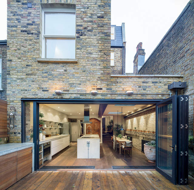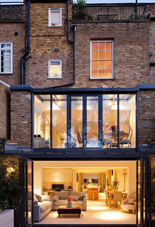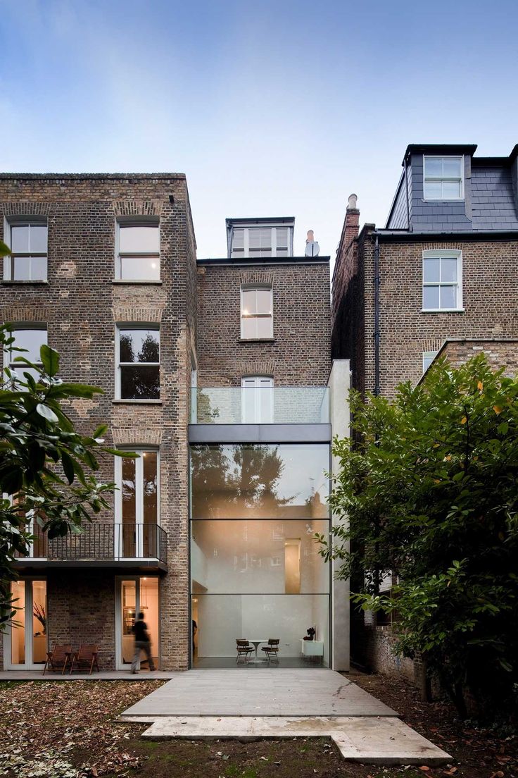 這是英國倫敦的一個老磚頭townhouse,正面乏善可陳,但有市容控制的限制,不能亂動,背後就鬆動了,這樣一改,老母雞變鴨了,有這樣的好地方,誰去遠郊的水泥盒子裏去住啊