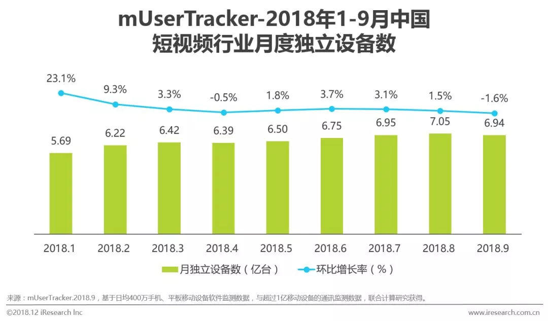 而mUserTracker數據則顯示,進入2018年以來,中國短視頻行業月獨立設備數的環比增長率逐漸放緩,短視頻行業用户紅利期已經開始消退,2018年9月短視頻月獨立設備數甚至出現小幅下降。