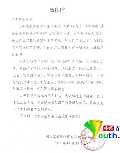 隨後記者在主辦方官方公眾號看到致歉信,聲稱由於公司疏忽和工作失誤,引發現場短時失序,造成廣大家長和參賽兒童的慌亂,作為活動主辦方負有不可推卸的責任,向廣大家長和市民朋友致以最誠摯的歉意。