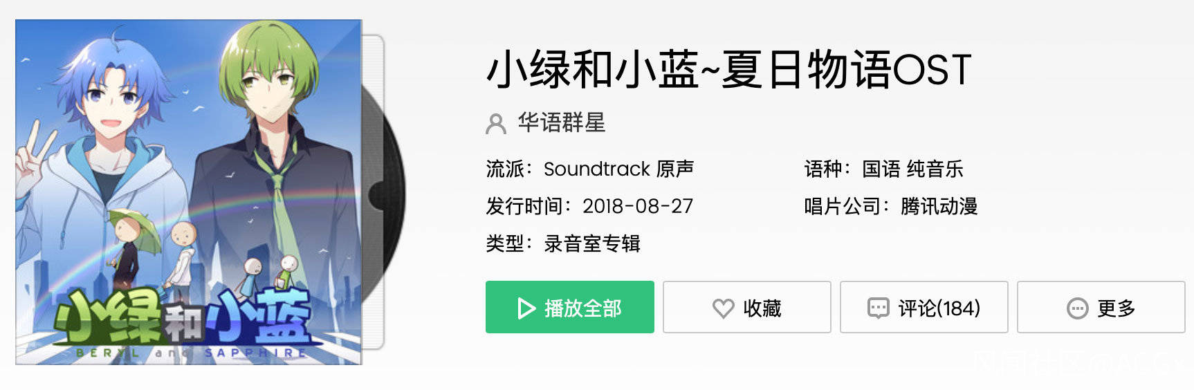 首先在動畫作品的首發期,動畫音樂完全可以作為宣傳物料展開作品的營銷。比如為了配合《小綠和小藍》的動畫首發,騰訊動漫在動畫上線的當日凌晨,就將名為《小綠和小藍~夏日物語OST》的動畫原聲專輯發佈到了QQ音樂平台,其中就包括動畫主題曲、插曲、配樂、伴奏等22首音樂作品,極大豐富了動畫作品的首發物料內容。