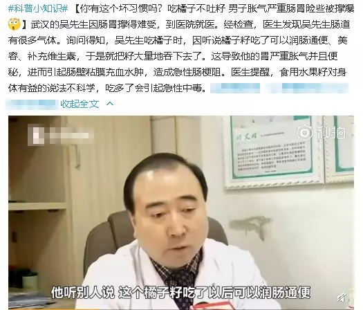 最近有報道稱,有人為了充分利用橘子籽潤腸通便的作用和攝取其中的營養素,在吞了大量橘子籽之後,造成急性腸梗阻↓↓↓