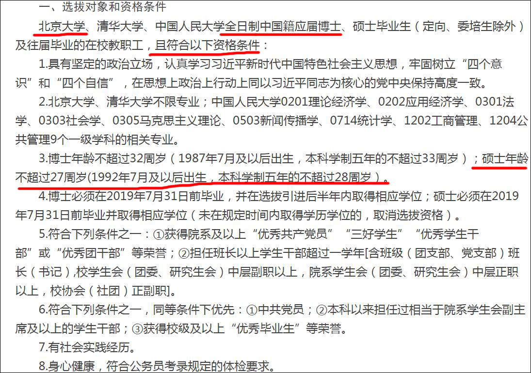 根據《公告》要求,選拔對象包括北京大學、清華大學、中國人民大學全日制中國籍應屆博士、碩士畢業生(定向、委培生除外)及往屆畢業的在校教職工。另外,博士年齡不超過32週歲(1987年7月及以後出生,本科學制五年的不超過33週歲);碩士年齡不超過27週歲(1992年7月及以後出生,本科學制五年的不超過28週歲)。《公告》同時説明,博士必須在2019年7月31日前,並在選拔引進後半年內取得學位,碩士則只要求了2019年7月31日前取得相應學位。根據《公告》,未在規定時間內取得學歷學位的,取消選拔資格。