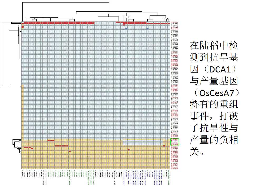 4. 發現在抗旱基因與產量基因連鎖區域會出現一些陸稻特有的、稀有重組類型(例如耐旱基因DCA1與產量相關基因OsCesA7)。這種特有的重組類型有助於打破抗旱性—產量之間的負相關,使植株兼具高產與抗旱性。當然,仍需要在育種實踐中驗證產量—抗旱基因的重組對打破抗旱性—產量負相關的作用,某些關鍵重組事件或許能成為水稻抗旱育種的一類有效分子標記。