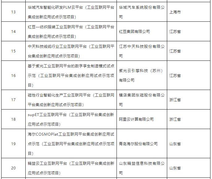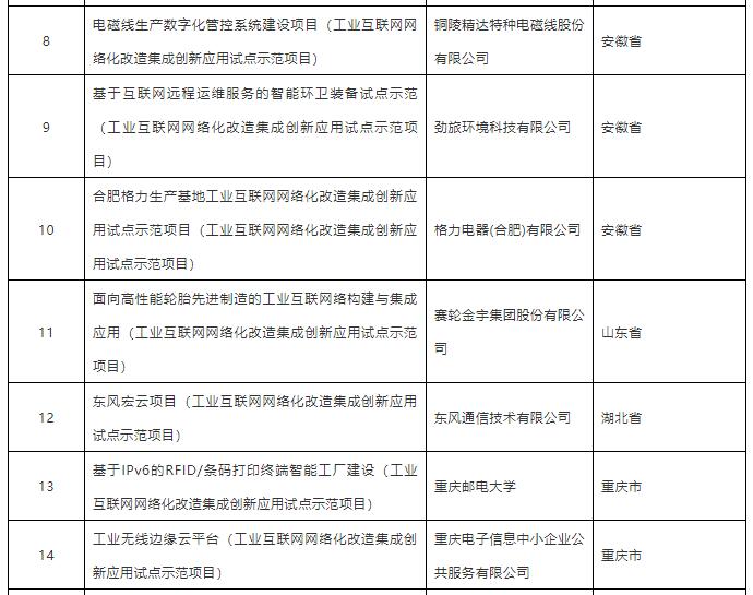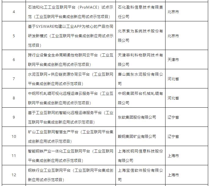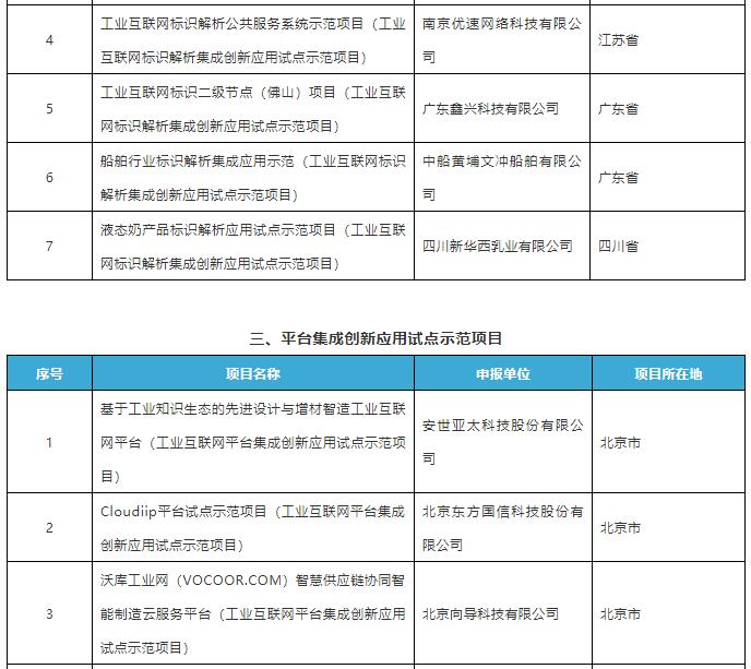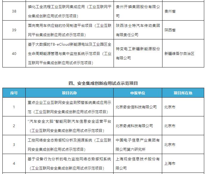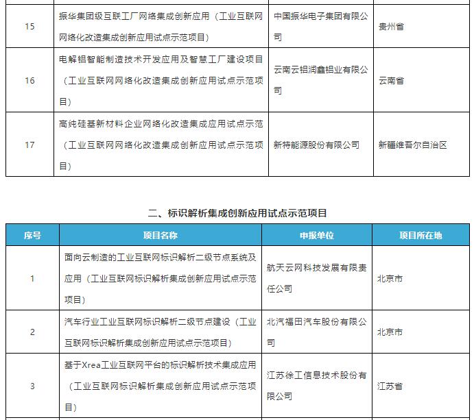 本次公示的72個試點示範項目包括網絡化改造集成創新應用試點示範17項,標識解析集成創新應用試點示範7項,平台集成創新應用試點示範40項,安全集成創新應用試點示範項8項。 公佈數據顯示,上海6家,北京10家,天津2家,廣東省9家,浙江和江蘇有8家,安徽省4家,其餘分別在四川、重慶、河北等地,相對於中原地區來説,新疆的特變電工新年能源股份有限公司和新特能源有限公司,作為高純硅基新材料和基於大數據的TB-eCloud新能源電站及工業園區全生命週期能源管理成為西北地區企業上榜的優勢條件,這也反映了國家對新能源的重視度。