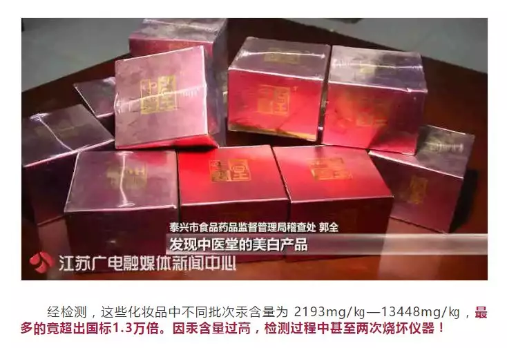 經過有關部門後續檢測,這款美白祛痘的化妝品,不同批次汞含量為2193毫克/千克-13448毫克/千克,國家規定化妝品汞含量不得超過1毫克/千克,可見此化妝品最多竟超出國標1.3萬倍!